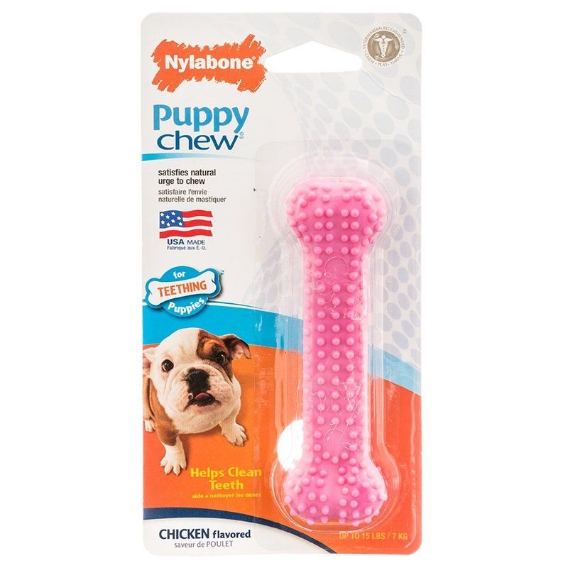 Nylabone Puppy Chew Dental Bone Chew Toys are safe, beneficial and entertaining chews for teething puppies. Like all dogs, puppies have a natural urge to chew, and these bone shaped toys provide an outlet that keeps your furniture, shoes and slippers safe. Bristles that rise up during chewing also help to clean teeth and control plaque and tartar for a healthy mouth. And the delicious chicken flavor means your pup will never say no to a chew!
